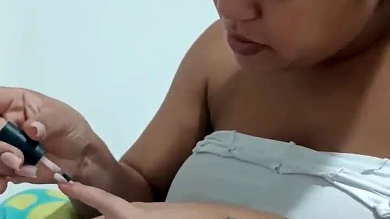 Colombian amateur masturbates her wet shaved pussy close-up while wife does nails