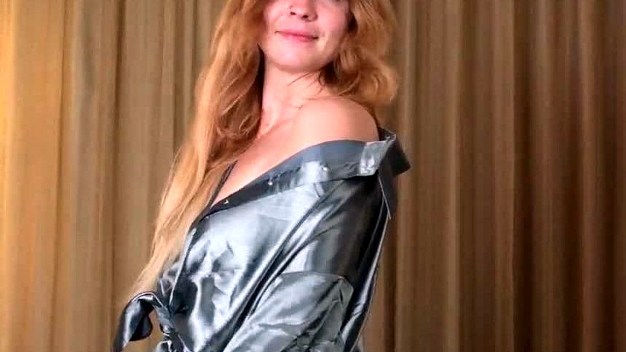 Hazel Ash slips into model's strange yoga pants leggings shiny shirt stiletto boots